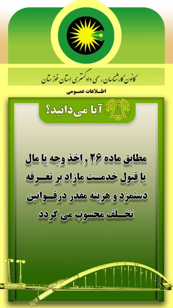 به گزارش روابط عمومی و به نقل از کمیته آموزش کانون کارشناسان رسمی دادگستری استان خوزستان: مطابق ماده ۲۶ قانون کارشناسان رسمی دادگستری .اخذ وجه یا مال یا قبول خدمت مازاد بر تعرفه دستمزد و هزینه مقدر در قوانین ؛تخلف محسوب می گردد.