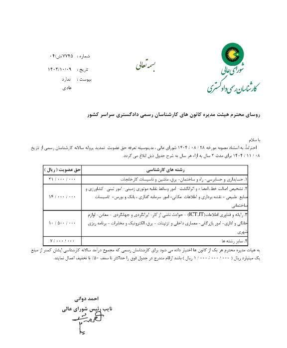 به گزارش روابط عمومی کانون کارشناسان رسمی دادگستری خوزستان :شورای عالی کارشناسان رسمی دادگستری در مکاتبه ای با کانون های استانی خود تعرفه حق عضویت تمدید پروانه سالانه را اعلام کرد. *برای رشتههای حسابداری و حسابرسی ،راه و ساختمان ،برق ،ماشین و کارخانجات ( ۲۱میلیون ریال ) *تشخیص اصالت ...